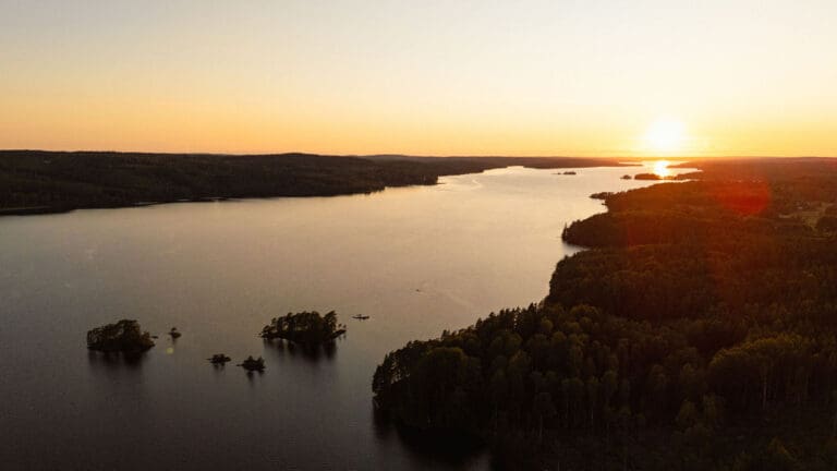 L'été en Suède, le temps tourne au ralentit. Le soleil se couche lentement derrière l'horizon, ce qui fait que le ciel et l'eau prennent souvent des teintes profondes d'orange et de violet pendant des heures. C'est le moment où le vent se calme et où le lac se transforme en un miroir parfait.